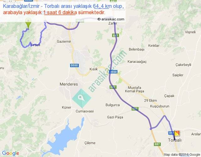 Karabağlar İzmir - Torbalı arası yaklaşık olarak 90 km/h ile yukarıda belirtilen sürede olup, iki yerin kuş uçuşu uzaklığı (mesafesi) 35'dir. Yolculuk otobüsle 1 saat 25 dakika sürmektedir.