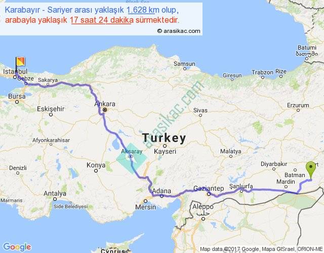 Karabayır - Sariyer arası yaklaşık olarak 90 km/h ile yukarıda belirtilen sürede olup, iki yerin kuş uçuşu uzaklığı (mesafesi) 1160'dir. Eğer belirtilen yerler arasında uçak seferi var ise bu süre uçakla 1 saat 47 dakika'ya kadar düşebilir. Yolculuk otobüsle 22 saat 37 dakika sürmektedir.