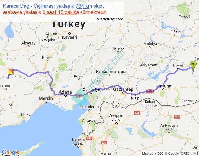Karaca Dağ - Çiğil arası yaklaşık olarak 90 km/h ile yukarıda belirtilen sürede olup, iki yerin kuş uçuşu uzaklığı (mesafesi) 573'dir. Eğer belirtilen yerler arasında uçak seferi var ise bu süre uçakla 52 dakika'ya kadar düşebilir. Yolculuk otobüsle 12 saat 1 dakika sürmektedir.