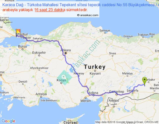Karaca Dağ - Türkoba Mahallesi Tepekent sİtesi tepecik caddesi No:55 Büyükçekmece arası yaklaşık olarak 90 km/h ile yukarıda belirtilen sürede olup, iki yerin kuş uçuşu uzaklığı (mesafesi) 1038'dir. Eğer belirtilen yerler arasında uçak seferi var ise bu süre uçakla 1 saat 35 dakika'ya kadar düşebilir. Yolculuk otobüsle 21 saat 17 dakika sürmektedir.