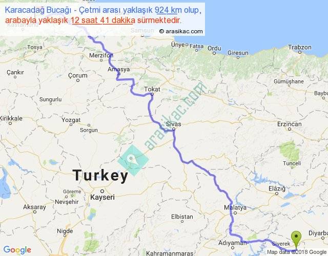 Karacadağ Bucağı - Çetmi arası yaklaşık olarak 90 km/h ile yukarıda belirtilen sürede olup, iki yerin kuş uçuşu uzaklığı (mesafesi) 632'dir. Eğer belirtilen yerler arasında uçak seferi var ise bu süre uçakla 58 dakika'ya kadar düşebilir. Yolculuk otobüsle 16 saat 29 dakika sürmektedir.