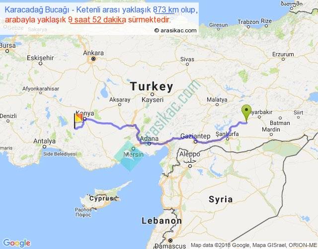 Karacadağ Bucağı - Ketenli arası yaklaşık olarak 90 km/h ile yukarıda belirtilen sürede olup, iki yerin kuş uçuşu uzaklığı (mesafesi) 664'dir. Eğer belirtilen yerler arasında uçak seferi var ise bu süre uçakla 1 saat 01 dakika'ya kadar düşebilir. Yolculuk otobüsle 12 saat 49 dakika sürmektedir.