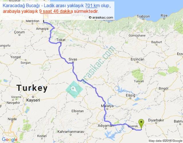 Karacadağ Bucağı - Ladik arası yaklaşık olarak 90 km/h ile yukarıda belirtilen sürede olup, iki yerin kuş uçuşu uzaklığı (mesafesi) 475'dir. Eğer belirtilen yerler arasında uçak seferi var ise bu süre uçakla 43 dakika'ya kadar düşebilir. Yolculuk otobüsle 12 saat 41 dakika sürmektedir.