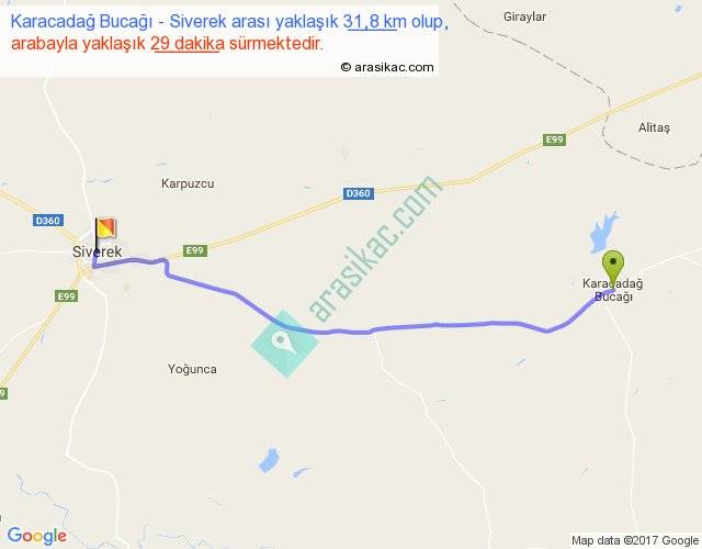 Karacadağ Bucağı - Siverek arası yaklaşık olarak 90 km/h ile yukarıda belirtilen sürede olup, iki yerin kuş uçuşu uzaklığı (mesafesi) 28'dir. Yolculuk otobüsle 37 dakika sürmektedir.