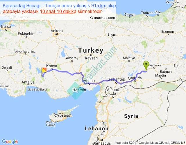 Karacadağ Bucağı - Taraşcı arası yaklaşık olarak 90 km/h ile yukarıda belirtilen sürede olup, iki yerin kuş uçuşu uzaklığı (mesafesi) 691'dir. Eğer belirtilen yerler arasında uçak seferi var ise bu süre uçakla 1 saat 03 dakika'ya kadar düşebilir. Yolculuk otobüsle 13 saat 13 dakika sürmektedir.