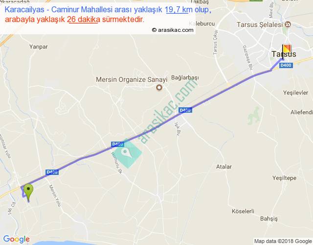 Karacailyas - Caminur Mahallesi arası yaklaşık olarak 90 km/h ile yukarıda belirtilen sürede olup, iki yerin kuş uçuşu uzaklığı (mesafesi) 18'dir. Yolculuk otobüsle 33 dakika sürmektedir.