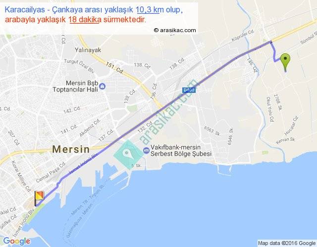 Karacailyas - Çankaya arası yaklaşık olarak 90 km/h ile yukarıda belirtilen sürede olup, iki yerin kuş uçuşu uzaklığı (mesafesi) 9'dir. Yolculuk otobüsle 23 dakika sürmektedir.
