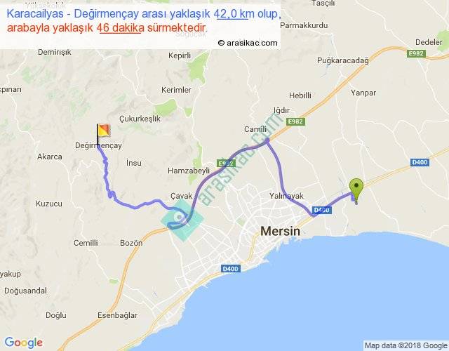 Karacailyas - Değirmençay arası yaklaşık olarak 90 km/h ile yukarıda belirtilen sürede olup, iki yerin kuş uçuşu uzaklığı (mesafesi) 23'dir. Yolculuk otobüsle 59 dakika sürmektedir.