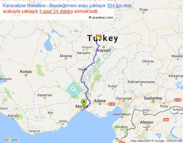 Karacailyas Mahallesi - Beydeğirmeni arası yaklaşık olarak 90 km/h ile yukarıda belirtilen sürede olup, iki yerin kuş uçuşu uzaklığı (mesafesi) 225'dir. Yolculuk otobüsle 4 saat 38 dakika sürmektedir.