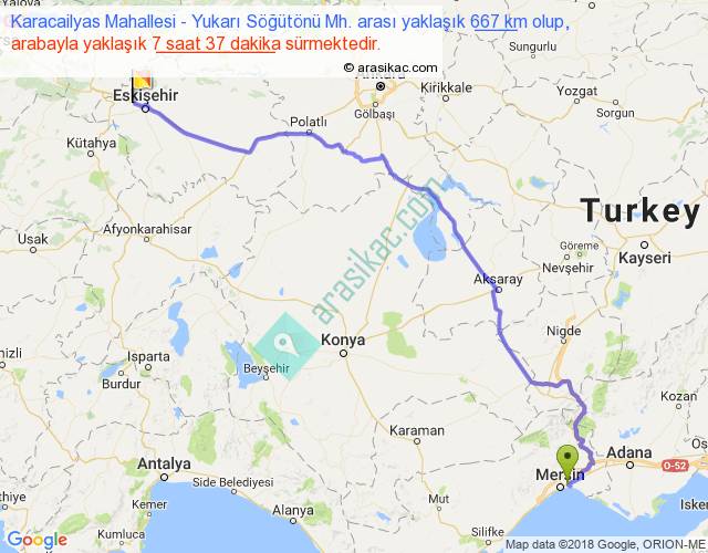 Karacailyas Mahallesi - Yukarı Söğütönü Mh. arası yaklaşık olarak 90 km/h ile yukarıda belirtilen sürede olup, iki yerin kuş uçuşu uzaklığı (mesafesi) 498'dir. Eğer belirtilen yerler arasında uçak seferi var ise bu süre uçakla 45 dakika'ya kadar düşebilir. Yolculuk otobüsle 9 saat 54 dakika sürmektedir.