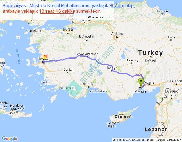 Karacailyas - Mustafa Kemal Mahallesi arası yaklaşık olarak 90 km/h ile yukarıda belirtilen sürede olup, iki yerin kuş uçuşu uzaklığı (mesafesi) 684'dir. Eğer belirtilen yerler arasında uçak seferi var ise bu süre uçakla 1 saat 03 dakika'ya kadar düşebilir. Yolculuk otobüsle 13 saat 59 dakika sürmektedir.