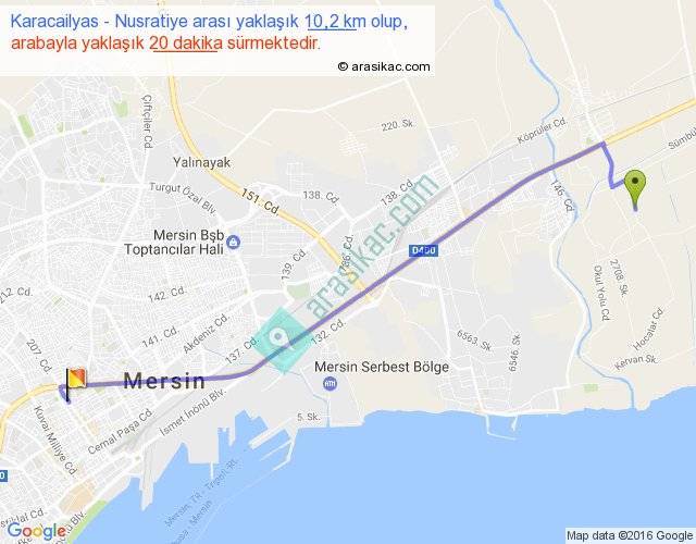 Karacailyas - Nusratiye arası yaklaşık olarak 90 km/h ile yukarıda belirtilen sürede olup, iki yerin kuş uçuşu uzaklığı (mesafesi) 8'dir. Yolculuk otobüsle 26 dakika sürmektedir.