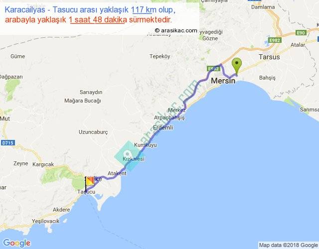 Karacailyas - Tasucu arası yaklaşık olarak 90 km/h ile yukarıda belirtilen sürede olup, iki yerin kuş uçuşu uzaklığı (mesafesi) 93'dir. Yolculuk otobüsle 2 saat 20 dakika sürmektedir.