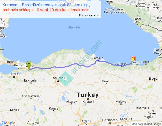 Karaçam - Beşikdüzü arası yaklaşık olarak 90 km/h ile yukarıda belirtilen sürede olup, iki yerin kuş uçuşu uzaklığı (mesafesi) 745'dir. Eğer belirtilen yerler arasında uçak seferi var ise bu süre uçakla 1 saat 08 dakika'ya kadar düşebilir. Yolculuk otobüsle 13 saat 24 dakika sürmektedir.