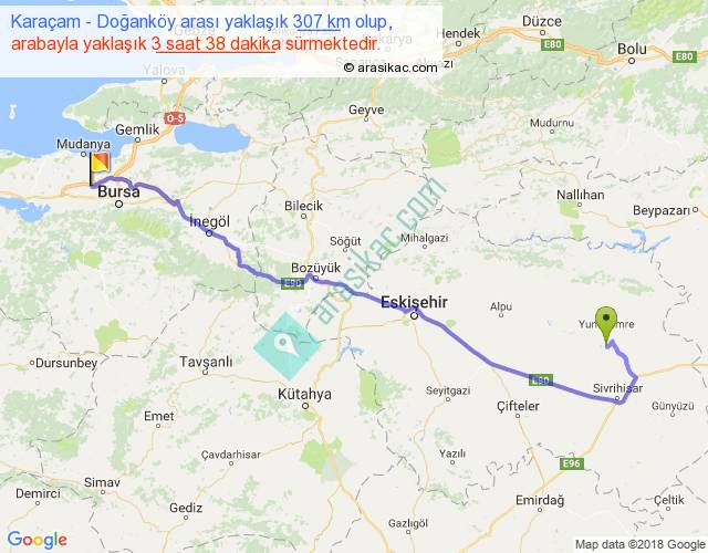 Karaçam - Doğanköy arası yaklaşık olarak 90 km/h ile yukarıda belirtilen sürede olup, iki yerin kuş uçuşu uzaklığı (mesafesi) 227'dir. Yolculuk otobüsle 4 saat 43 dakika sürmektedir.