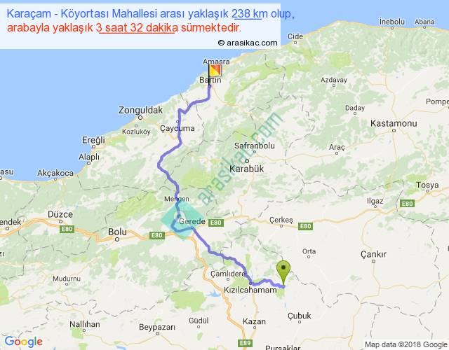 Karaçam - Köyortası Mahallesi arası yaklaşık olarak 90 km/h ile yukarıda belirtilen sürede olup, iki yerin kuş uçuşu uzaklığı (mesafesi) 140'dir. Yolculuk otobüsle 4 saat 35 dakika sürmektedir.
