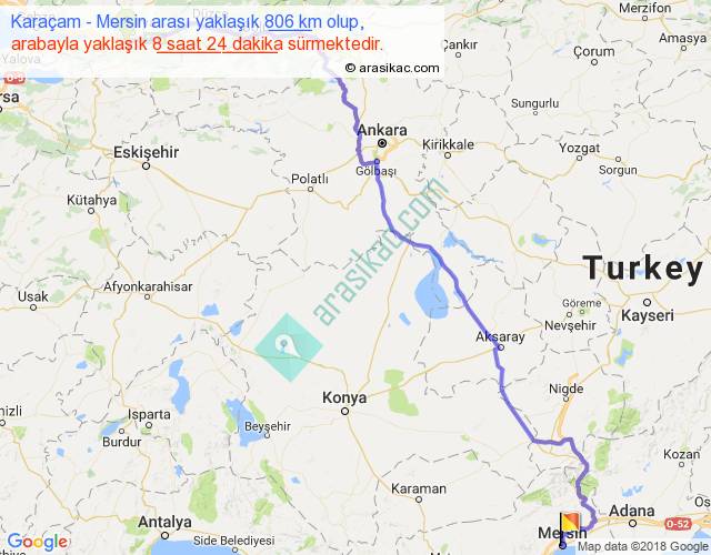 Karaçam - Mersin arası yaklaşık olarak 90 km/h ile yukarıda belirtilen sürede olup, iki yerin kuş uçuşu uzaklığı (mesafesi) 563'dir. Eğer belirtilen yerler arasında uçak seferi var ise bu süre uçakla 51 dakika'ya kadar düşebilir. Yolculuk otobüsle 10 saat 55 dakika sürmektedir.