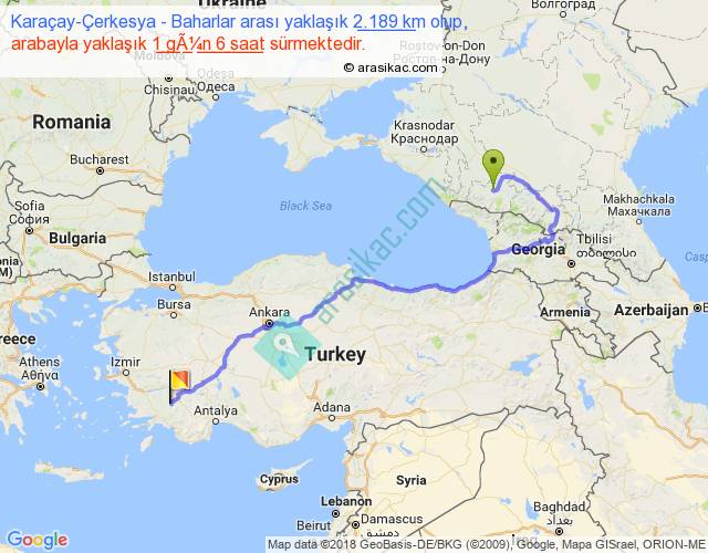 Karaçay-Çerkesya - Baharlar arası yaklaşık olarak 90 km/h ile yukarıda belirtilen sürede olup, iki yerin kuş uçuşu uzaklığı (mesafesi) 1285'dir. Eğer belirtilen yerler arasında uçak seferi var ise bu süre uçakla 1 saat 58 dakika'ya kadar düşebilir. Yolculuk otobüsle 1 gün 15 saat sürmektedir.