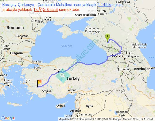 Karaçay-Çerkesya - Çamlaraltı Mahallesi arası yaklaşık olarak 90 km/h ile yukarıda belirtilen sürede olup, iki yerin kuş uçuşu uzaklığı (mesafesi) 1254'dir. Eğer belirtilen yerler arasında uçak seferi var ise bu süre uçakla 1 saat 55 dakika'ya kadar düşebilir. Yolculuk otobüsle 1 gün 15 saat sürmektedir.
