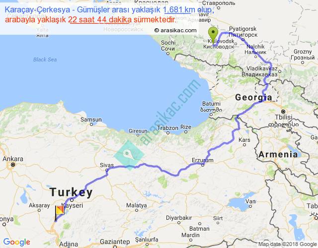 Karaçay-Çerkesya - Gümüşler arası yaklaşık olarak 90 km/h ile yukarıda belirtilen sürede olup, iki yerin kuş uçuşu uzaklığı (mesafesi) 872'dir. Eğer belirtilen yerler arasında uçak seferi var ise bu süre uçakla 1 saat 20 dakika'ya kadar düşebilir. Yolculuk otobüsle 1 gün 5 saat sürmektedir.