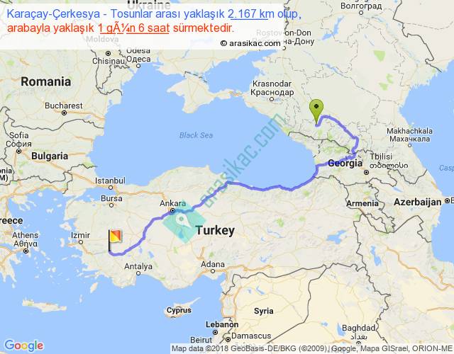 Karaçay-Çerkesya - Tosunlar arası yaklaşık olarak 90 km/h ile yukarıda belirtilen sürede olup, iki yerin kuş uçuşu uzaklığı (mesafesi) 1250'dir. Eğer belirtilen yerler arasında uçak seferi var ise bu süre uçakla 1 saat 55 dakika'ya kadar düşebilir. Yolculuk otobüsle 1 gün 15 saat sürmektedir.