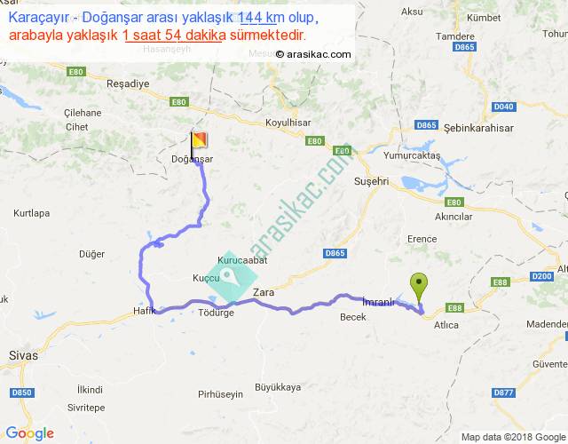 Karaçayır - Doğanşar arası yaklaşık olarak 90 km/h ile yukarıda belirtilen sürede olup, iki yerin kuş uçuşu uzaklığı (mesafesi) 70'dir. Yolculuk otobüsle 2 saat 28 dakika sürmektedir.
