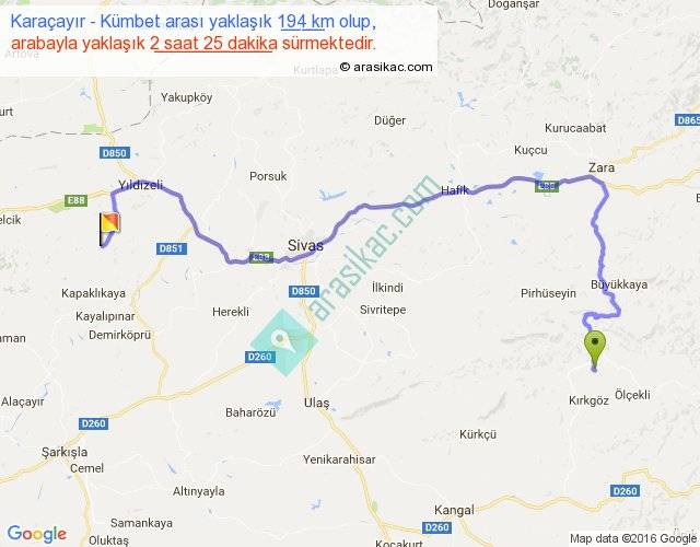 Karaçayır - Kümbet arası yaklaşık olarak 90 km/h ile yukarıda belirtilen sürede olup, iki yerin kuş uçuşu uzaklığı (mesafesi) 109'dir. Yolculuk otobüsle 3 saat 8 dakika sürmektedir.