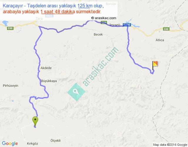 Karaçayır - Taşdelen arası yaklaşık olarak 90 km/h ile yukarıda belirtilen sürede olup, iki yerin kuş uçuşu uzaklığı (mesafesi) 52'dir. Yolculuk otobüsle 2 saat 20 dakika sürmektedir.