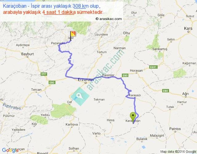Karaçoban - İspir arası yaklaşık olarak 90 km/h ile yukarıda belirtilen sürede olup, iki yerin kuş uçuşu uzaklığı (mesafesi) 157'dir. Yolculuk otobüsle 5 saat 13 dakika sürmektedir.