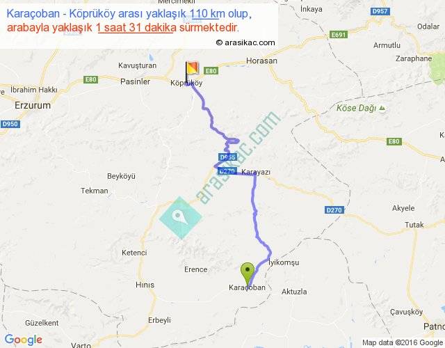Karaçoban - Köprüköy arası yaklaşık olarak 90 km/h ile yukarıda belirtilen sürede olup, iki yerin kuş uçuşu uzaklığı (mesafesi) 72'dir. Yolculuk otobüsle 1 saat 58 dakika sürmektedir.