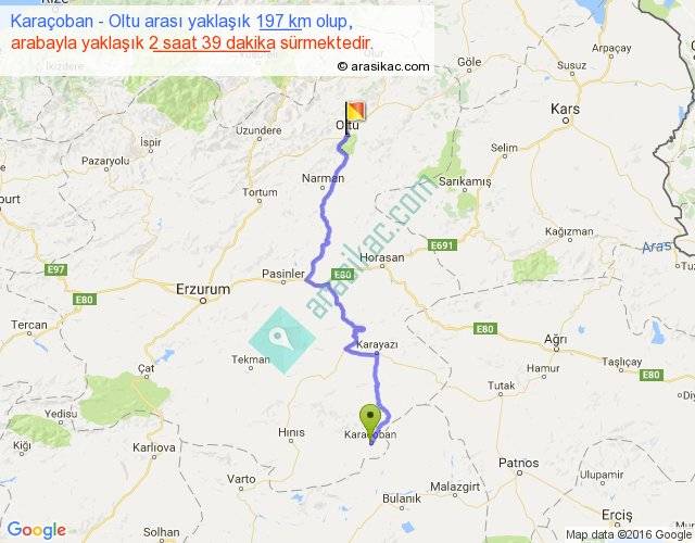 Karaçoban - Oltu arası yaklaşık olarak 90 km/h ile yukarıda belirtilen sürede olup, iki yerin kuş uçuşu uzaklığı (mesafesi) 132'dir. Yolculuk otobüsle 3 saat 26 dakika sürmektedir.