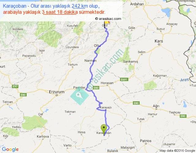 Karaçoban - Olur arası yaklaşık olarak 90 km/h ile yukarıda belirtilen sürede olup, iki yerin kuş uçuşu uzaklığı (mesafesi) 163'dir. Yolculuk otobüsle 4 saat 17 dakika sürmektedir.