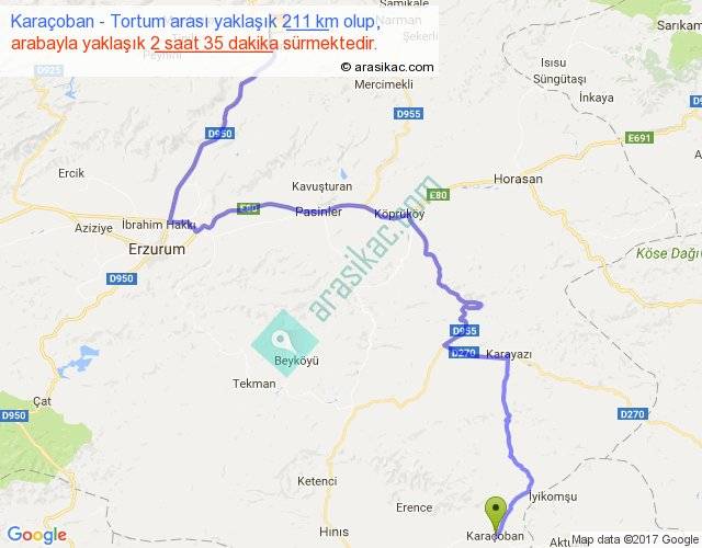 Karaçoban - Tortum arası yaklaşık olarak 90 km/h ile yukarıda belirtilen sürede olup, iki yerin kuş uçuşu uzaklığı (mesafesi) 115'dir. Yolculuk otobüsle 3 saat 21 dakika sürmektedir.