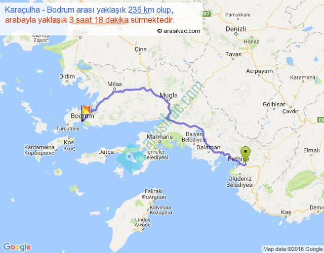 Karaçulha - Bodrum arası yaklaşık olarak 90 km/h ile yukarıda belirtilen sürede olup, iki yerin kuş uçuşu uzaklığı (mesafesi) 162'dir. Yolculuk otobüsle 4 saat 17 dakika sürmektedir.