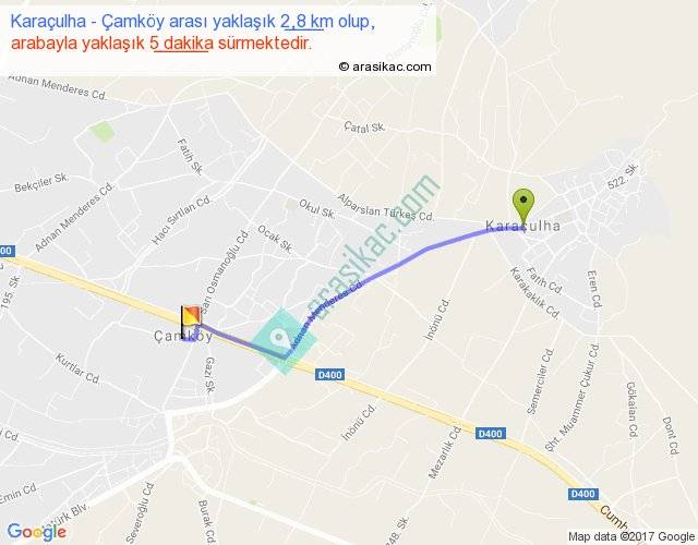 Karaçulha - Çamköy arası yaklaşık olarak 90 km/h ile yukarıda belirtilen sürede olup, iki yerin kuş uçuşu uzaklığı (mesafesi) 2'dir. Yolculuk otobüsle 6 dakika sürmektedir.
