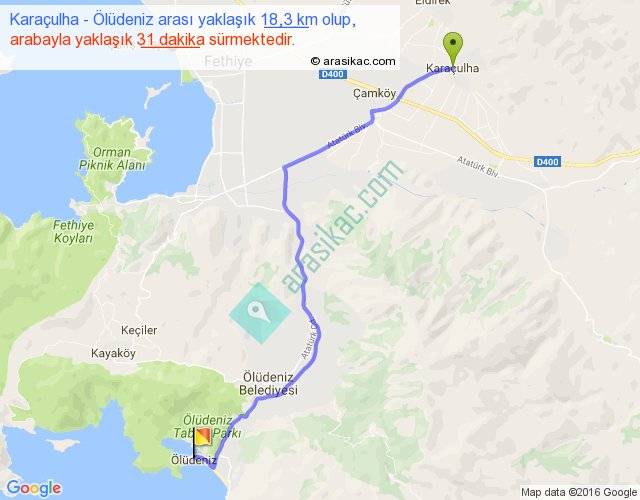 Karaçulha - Ölüdeniz arası yaklaşık olarak 90 km/h ile yukarıda belirtilen sürede olup, iki yerin kuş uçuşu uzaklığı (mesafesi) 14'dir. Yolculuk otobüsle 40 dakika sürmektedir.