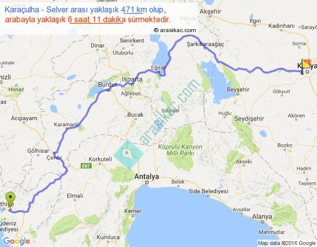 Karaçulha - Selver arası yaklaşık olarak 90 km/h ile yukarıda belirtilen sürede olup, iki yerin kuş uçuşu uzaklığı (mesafesi) 314'dir. Eğer belirtilen yerler arasında uçak seferi var ise bu süre uçakla 28 dakika'ya kadar düşebilir. Yolculuk otobüsle 8 saat 2 dakika sürmektedir.