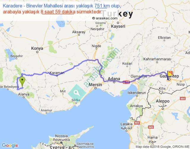 Karadere - Binevler Mahallesi arası yaklaşık olarak 90 km/h ile yukarıda belirtilen sürede olup, iki yerin kuş uçuşu uzaklığı (mesafesi) 477'dir. Eğer belirtilen yerler arasında uçak seferi var ise bu süre uçakla 44 dakika'ya kadar düşebilir. Yolculuk otobüsle 11 saat 40 dakika sürmektedir.
