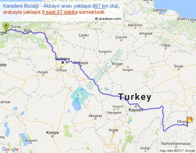 Karadere Bucağı - Akbayır arası yaklaşık olarak 90 km/h ile yukarıda belirtilen sürede olup, iki yerin kuş uçuşu uzaklığı (mesafesi) 624'dir. Eğer belirtilen yerler arasında uçak seferi var ise bu süre uçakla 57 dakika'ya kadar düşebilir. Yolculuk otobüsle 12 saat 30 dakika sürmektedir.