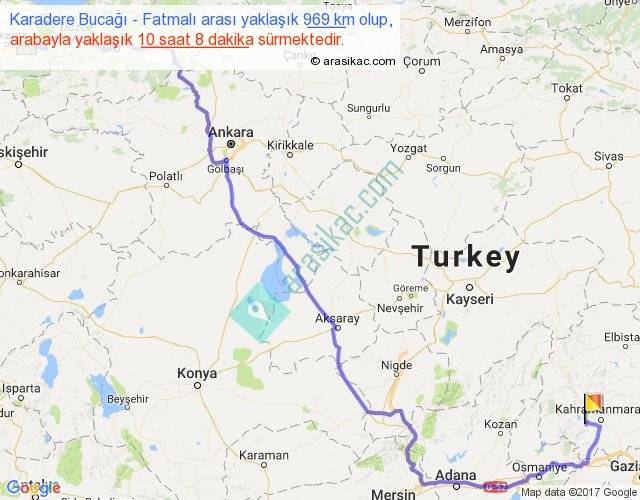 Karadere Bucağı - Fatmalı arası yaklaşık olarak 90 km/h ile yukarıda belirtilen sürede olup, iki yerin kuş uçuşu uzaklığı (mesafesi) 619'dir. Eğer belirtilen yerler arasında uçak seferi var ise bu süre uçakla 57 dakika'ya kadar düşebilir. Yolculuk otobüsle 13 saat 10 dakika sürmektedir.