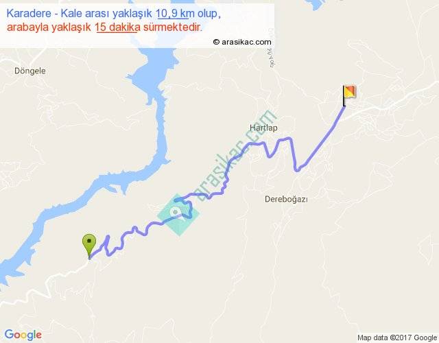 Karadere - Kale arası yaklaşık olarak 90 km/h ile yukarıda belirtilen sürede olup, iki yerin kuş uçuşu uzaklığı (mesafesi) 7'dir. Yolculuk otobüsle 19 dakika sürmektedir.