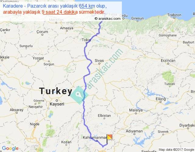 Karadere - Pazarcık arası yaklaşık olarak 90 km/h ile yukarıda belirtilen sürede olup, iki yerin kuş uçuşu uzaklığı (mesafesi) 398'dir. Eğer belirtilen yerler arasında uçak seferi var ise bu süre uçakla 36 dakika'ya kadar düşebilir. Yolculuk otobüsle 12 saat 13 dakika sürmektedir.