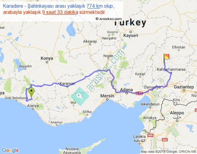 Karadere - Şahinkayası arası yaklaşık olarak 90 km/h ile yukarıda belirtilen sürede olup, iki yerin kuş uçuşu uzaklığı (mesafesi) 432'dir. Eğer belirtilen yerler arasında uçak seferi var ise bu süre uçakla 39 dakika'ya kadar düşebilir. Yolculuk otobüsle 12 saat 24 dakika sürmektedir.