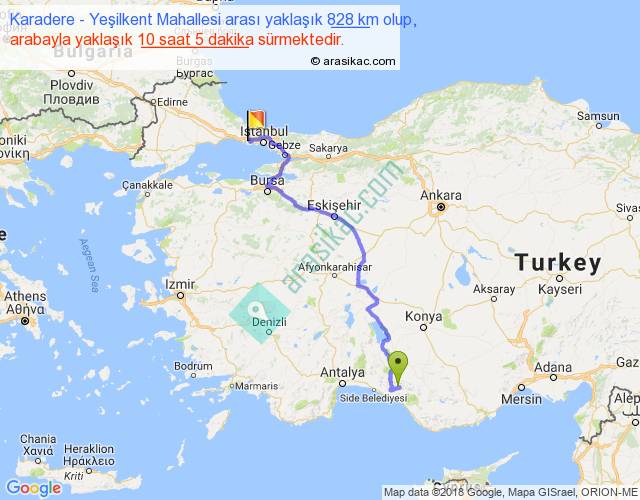 Karadere - Yeşilkent Mahallesi arası yaklaşık olarak 90 km/h ile yukarıda belirtilen sürede olup, iki yerin kuş uçuşu uzaklığı (mesafesi) 542'dir. Eğer belirtilen yerler arasında uçak seferi var ise bu süre uçakla 50 dakika'ya kadar düşebilir. Yolculuk otobüsle 13 saat 6 dakika sürmektedir.