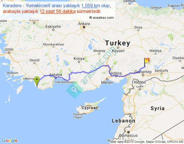 Karadere - Yumaklıcerit arası yaklaşık olarak 90 km/h ile yukarıda belirtilen sürede olup, iki yerin kuş uçuşu uzaklığı (mesafesi) 742'dir. Eğer belirtilen yerler arasında uçak seferi var ise bu süre uçakla 1 saat 08 dakika'ya kadar düşebilir. Yolculuk otobüsle 16 saat 48 dakika sürmektedir.