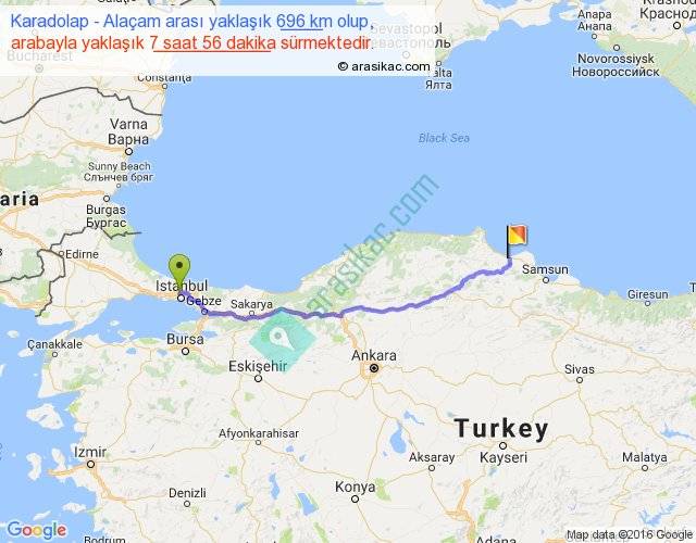 Karadolap - Alaçam arası yaklaşık olarak 90 km/h ile yukarıda belirtilen sürede olup, iki yerin kuş uçuşu uzaklığı (mesafesi) 556'dir. Eğer belirtilen yerler arasında uçak seferi var ise bu süre uçakla 51 dakika'ya kadar düşebilir. Yolculuk otobüsle 10 saat 18 dakika sürmektedir.