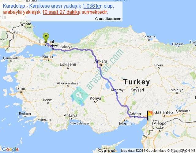 Karadolap - Karakese arası yaklaşık olarak 90 km/h ile yukarıda belirtilen sürede olup, iki yerin kuş uçuşu uzaklığı (mesafesi) 785'dir. Eğer belirtilen yerler arasında uçak seferi var ise bu süre uçakla 1 saat 12 dakika'ya kadar düşebilir. Yolculuk otobüsle 13 saat 35 dakika sürmektedir.