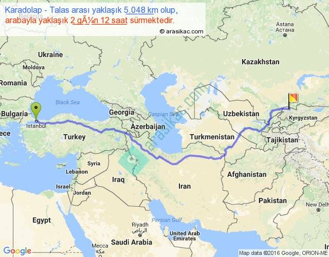 Karadolap - Talas arası yaklaşık olarak 90 km/h ile yukarıda belirtilen sürede olup, iki yerin kuş uçuşu uzaklığı (mesafesi) 3532'dir. Eğer belirtilen yerler arasında uçak seferi var ise bu süre uçakla 5 saat 26 dakika'ya kadar düşebilir. Yolculuk otobüsle 3 gün 6 saat sürmektedir.