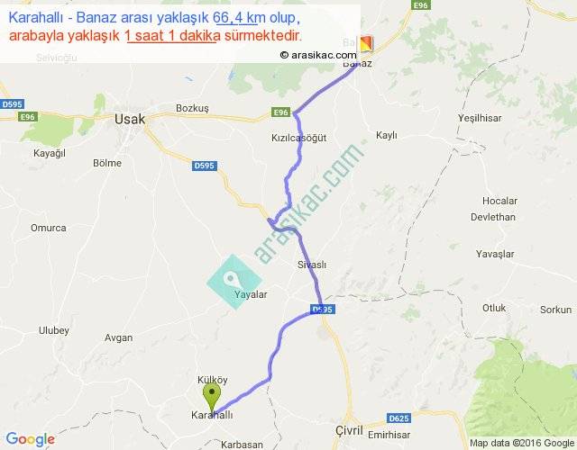 Karahallı - Banaz arası yaklaşık olarak 90 km/h ile yukarıda belirtilen sürede olup, iki yerin kuş uçuşu uzaklığı (mesafesi) 50'dir. Yolculuk otobüsle 1 saat 19 dakika sürmektedir.