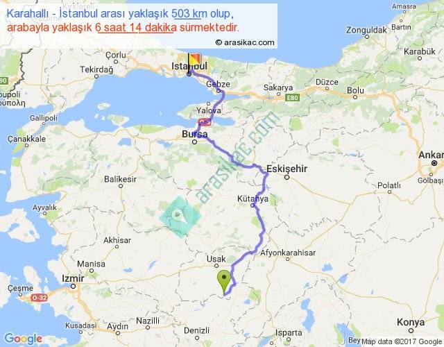 Karahallı - İstanbul arası yaklaşık olarak 90 km/h ile yukarıda belirtilen sürede olup, iki yerin kuş uçuşu uzaklığı (mesafesi) 301'dir. Eğer belirtilen yerler arasında uçak seferi var ise bu süre uçakla 27 dakika'ya kadar düşebilir. Yolculuk otobüsle 8 saat 6 dakika sürmektedir.